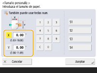 Pulse <X> o <Y> para introducir la longitud de cada cara mediante las teclas numéricas. ![]() Si registra el tamaño de papel que utiliza con más frecuencia en los botones <S1> a <S4>, puede recuperarlo con un solo toque. Registrar papel de tamaño libre (Tamaño de papel personalizado) | |
