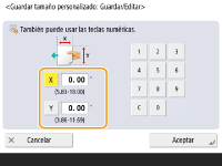 Especifique la longitud del lado <X> y del lado <Y>. Pulse <X> o <Y> para introducir la longitud de cada lado con las teclas numéricas.