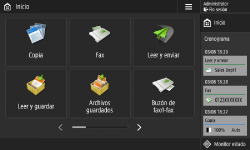 En la pantalla <Inicio>, pulse los botones de función para ver la pantalla de Funciones básicas, donde podrá acceder a funciones básicas como copiar, enviar faxes y escanear. A pesar de que la pantalla y las opciones de la pantalla Características básicas difieren según las opciones, podrá cambiar las opciones en función de sus necesidades. Personalizar la pantalla Funciones básicas