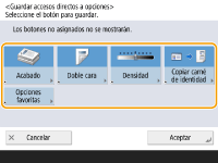 Los botones de opciones que aparecen en la pantalla de funciones básicas (de copia, fax y lectura) se pueden cambiar con otros botones de configuración en <Opciones>. Al situar los botones de opciones de uso frecuente en la pantalla de funciones básicas, puede utilizar las funciones de forma más eficiente. Además, al iniciar sesión con gestión de autenticación personal, puede mostrar una pantalla de funciones básicas personalizada para cada usuario.