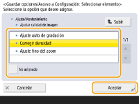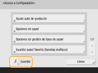 Si <Acceso directo Configuración> no se muestra en la pantalla de <Inicio>, pulse  <Opciones de gestión de inicio>  <Restringir funciones mostradas>  <Establecer>  configure <Acceso directo Configuración> para que se muestre. Accesos directos que pueden registrarse: 10 |