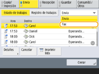Para cancelar inmediatamente un trabajo que se está enviandoSi pulsa en el panel de control para cancelar un trabajo de fax mientras se está enviando, aparecerá el mensaje <¿Desea cancelar el siguiente trabajo de envío?>. Pulse <Sí> para cancelar el fax.Puede seleccionar <Último trabajo recibido> o <Trabajo que se está enviando> seleccionar el trabajo que desea cancelar. <Trabajo que se cancelará al pulsar Detener> Pulse cuando haya varios trabajos de envío que mostrar en la pantalla para seleccionar el trabajo de envío que desea cancelar. Si no se muestra el trabajo de envío que desea cancelar, pulse <Compruebe otros trab.> para mostrar <Trabajos de envío>. Seleccione el trabajo que desea cancelar y pulse <Cancelar>. |