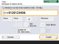 Comprobar el número total de destinos especificadosEn la parte superior de la pantalla se muestra el número total de destinos especificados. Esto le permite confirmar que el número de destinos es correcto antes de proceder al envío. ![]() Para enviar con la información del remitentePuede enviar con el nombre y el número de fax del remitente. <ID de terminal TX> Para consultar los estados de los documentos enviadosEn la pantalla <Monitor estado>, puede consultar los estados de los documentos enviados. En esta pantalla puede volver a enviar faxes o cancelar el envío tras consultar los estados. Comprobación del estado y el registro de los documentos enviados y recibidos Cuando <Mostrar notificación cuando se acepta el trabajo> está establecido en <On>, la pantalla <Monitor estado> puede mostrarse desde la siguiente pantalla mostrada tras la recepción de un trabajo enviado.<Mostrar notificación cuando se acepta el trabajo> ![]() Si se produce un error de transmisión porque la línea del destinatario comunicaEl equipo vuelve a marcar automáticamente tras un cierto período de tiempo. Puede cambiar la configuración relativa a cuántas veces vuelve a marcar el equipo y al intervalo entre marcaciones. <Remarcación auto> Para imprimir el informe de los resultados del envíoEn la pantalla de funciones básicas de fax, al pulsar <Opciones> <Informe result. de TX> puede configurar que se imprima automáticamente el informe con la lista de resultados del envío.Para establecer esto para cada trabajo en <Opciones>, es necesario seleccionar <Sólo en caso de error> o <No> en <Informe result. de TX> y, a continuación, configurar <Permitir impresión desde opciones> en <Sí>. Cuando se configuran varias líneas telefónicasPara seleccionar la línea telefónica que desea utilizar para el envío de faxes, pulse <Opciones> <Seleccionar línea>. Para obtener instrucciones acerca de la especificación de las opciones de la línea de fax, consulte Opciones de línea de fax. |