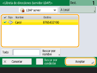<Guardar nuevo dest.>, <Detalles/Editar> y <Eliminar> en <Guardar/Editar> en la pantalla <Libreta de direcciones (local)> pueden utilizarse para registrar nuevos destinos, comprobar detalles y editar/eliminar destinos. Para utilizar la libreta de direcciones remotas, es necesario configurar los ajustes del equipo servidor. Establezca en abierto la libreta de direcciones remota de forma externa en el equipo servidor. |