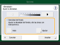 ![]() | Puede ajustar la densidad del fondo. Puede enviar con claridad originales con un fondo en color o documentos finos, como periódicos, cuyos caracteres e imágenes en el reverso son visibles en transparencia. Ajustar la densidad del fondo |