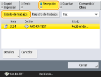 Si selecciona un documento y pulsa <Cancelar>, podrá cancelar la recepción. No puede seleccionar varios trabajos y cancelarlos todos a la vez. Seleccione y cancele un trabajo cada vez.