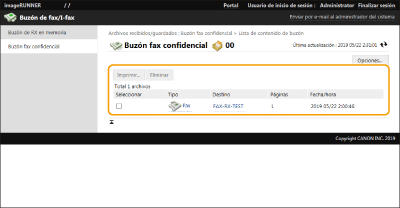 ![]() | Puede utilizar la IU remota para imprimir, enviar o eliminar faxes e I-faxes que se han almacenado temporalmente en el Buzón de fax/I-fax. |