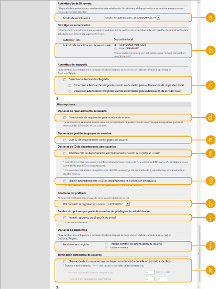 Seleccione la casilla de verificación para asignar un ID de departamento cuando registre/edite un usuario mediante la IU remota. No se asignará un nuevo ID de departamento si ya se ha asignado uno. Este ajuste solo se puede especificar desde la IU remota.