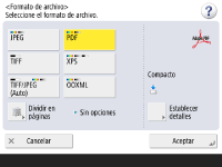 ![]() | Los originales escaneados se convierten en archivos electrónicos como PDF. Seleccione el formato de archivo en función de la finalidad y del entorno de uso. |