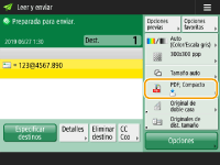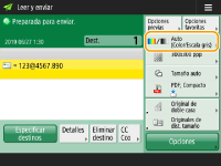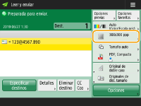 Comprobar el número total de destinos especificadosEn la parte superior derecha de la pantalla se muestra el número total de destinos especificados. Esto le permite confirmar antes de proceder al envío que el número de destinos es correcto. ![]() Para cancelar inmediatamente un trabajo que se está enviandoSi pulsa en el panel de control mientras se está enviando un trabajo, aparecerá el mensaje <¿Desea cancelar el siguiente trabajo de envío?>. Pulse <Sí> para cancelar el envío.Puede seleccionar <Último trabajo recibido> o <Trabajo que se está enviando> seleccionar el trabajo que desea cancelar. <Trabajo que se cancelará al pulsar Detener> Pulse cuando haya varios trabajos de envío que mostrar en la pantalla para seleccionar el trabajo de envío que desea cancelar. Si no se muestra el trabajo de envío que desea cancelar, pulse <Compruebe otros trab.> para mostrar <Trabajos de envío>. Seleccione el trabajo que desea cancelar y pulse <Cancelar>.Para consultar los estados de los documentos enviados/guardadosEn la pantalla <Monitor estado>, puede consultar los estados de los documentos enviados. En esta pantalla puede volver a enviar/guardar faxes o cancelar el envío/guardado tras consultar los estados. Comprobar el estado y el registro de los documentos escaneados Cuando <Mostrar notificación cuando se acepta el trabajo> está establecido en <Sí>, la pantalla <Monitor estado> puede mostrarse desde la siguiente pantalla mostrada tras la recepción de un trabajo enviado.<Mostrar notificación cuando se acepta el trabajo> ![]() Para imprimir el informe de los resultados del envío/guardadoEn la pantalla de Funciones básicas de lectura, al pulsar <Opciones> <Informe result. de TX> puede configurar que se imprima automáticamente el informe con la lista de resultados del envío/guardado.Para establecer esto para cada trabajo en <Opciones>, es necesario seleccionar <Sólo en caso de error> o <No> en <Informe result. de TX> y, a continuación, configurar <Permitir impresión desde opciones> en <Sí>. Nombre de archivoCuando se envía/guarda un archivo, el nombre de archivo se establece automáticamente según el formato siguiente. Puede cambiar la configuración para poder asignar un nombre. Configurar un nombre de archivo Al enviar por correo electrónico "Números de trabajo (cuatro dígitos)_números de página (tres dígitos).nombre de extensión de archivo", como "1042_001.jpg" Al guardar en un servidor de archivos "El año, mes, día, hora, minuto y segundo en que se guarda el archivo (14 dígitos).nombre de extensión de archivo", como "20151030133541.jpg" Asunto del correo electrónicoEl asunto introducido en <Asunto prefijado> se establece automáticamente (<Asunto prefijado>). Si especifica un asunto distinto, cambie la opción o especifíquelo cada vez que envíe un correo electrónico (Especificar las opciones de correo electrónico). |