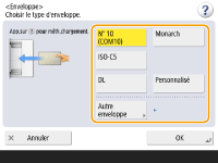 1 | Appuyez sur <Enveloppe>. Le type de papier d'enveloppe ne peut pas être sélectionné à partir de l'écran des détails de <Type de papier>. Pour sélectionner le type de papier d'enveloppe, mémorisez le type de papier dans <Mémoriser papier favori (plateau MF)>, puis appuyez sur <Papier favori> à l'étape 2 la touche sur laquelle le type de papier d'enveloppe a été mémorisé <OK>. Enregistrement du format et du type de papier fréquemment utilisé avec le plateau multifonctions |