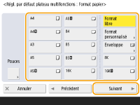 1 | Appuyez sur <Format personnalisé>. ![]() Vous pouvez spécifier la taille de papier <Format libre>, vous n'aurez alors pas besoin d'indiquer le réglage de la taille de papier. Spécifiez <Format libre> lorsque vous chargez du papier de taille inconnue pour faire des photocopies ou lorsque la taille de papier est déjà enregistrée dans le pilote de l'imprimante. |