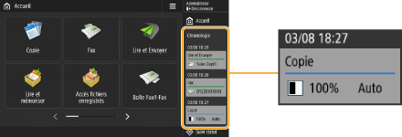 La ligne de temps est une fonction pratique pour utiliser régulièrement les mêmes réglages et destinataires pour les fonctions « Copie » et « Lire et Envoyer », etc. L'historique des réglages utilisés est automatiquement ajouté à la ligne de temps et peut être utilisé pour rappeler les mêmes réglages en appuyant dessus.