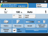 Affiche l'état des réglages, comme l'agrandissement, le format papier et le nombre de copies. Veillez à vérifier les réglages afin de copier correctement. Pour modifier les réglages, appuyez sur le bouton sous la section affichage.
