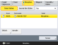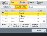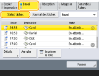 Appuyer sur <Détails> <Envoyer à nouveau> vous permet de renvoyer les documents qui n'ont pas pu être envoyés. Pour spécifier d'autres destinations, appuyez sur <Modifier destinataire>. Pour des documents ayant des destinations multiples spécifiées, en utilisant la même méthode, appuyez sur <Liste de diffusion>, sélectionnez une destination, et appuyez ensuite sur <Envoyer à nouveau> ou <Modifier destinataire>.Vous pouvez renvoyer des documents quand <Supprimer document après erreur d'émission> est défini sur <Non> (<Supprimer document après erreur d'émission>). Notez que vous ne pouvez pas renvoyer les documents envoyés avec Envoi direct/Envoi manuel/Fax PC. Vous pouvez modifier les destinations des documents qui sont définis pour être envoyés à une heure spécifique ainsi que les documents qui n'ont pas pu être envoyés. Notez que vous ne pouvez pas modifier la destination des documents ayant des destinations multiples spécifiées qui sont en cours d'envoi ou quand la saisie d'une nouvelle destination est limitée (Restriction des destinataires disponibles). La destination peut être modifiée pour une tâche annulée en raison d'erreurs de transmission, ou une tâche en attente d'être envoyée dans le mode Envoi différé. Vous ne pouvez pas modifier plusieurs destinations en même temps. De même, vous ne pouvez pas modifier les destinations dans un groupe en même temps. |