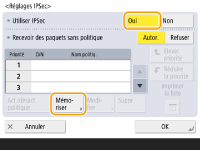 Gestion des politiques IPSecVous pouvez modifier les politiques sur l'écran affiché à l'étape 3. Pour modifier les détails d'une politique, sélectionnez la politique dans la liste et appuyez sur <Modifier>. Pour désactiver une politique, sélectionnez la politique dans la liste et appuyez sur <Act./désact. politique>. Pour supprimer une politique, sélectionnez-la dans la liste et appuyez sur <Supprimer> <Oui>. |