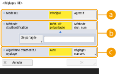 2 | Configurez les réglages nécessaires. ![]() <Validité>Définissez une période de validité pour l'IKE SA et l'IPSec SA générés. N'oubliez pas de régler <Heure> ou <Format>. Si vous réglez les deux, la période de validité prend fin à la première valeur atteinte. <PFS>Si vous réglez la fonction Perfect Forward Secrecy (PFS) sur <Oui>, la confidentialité de la clé de cryptage est renforcée, mais la vitesse de communication est plus lente. En outre, la fonction PFS doit être activée sur l'homologue de communication. <Algorithme d'authentif./cryptage>Sélectionnez <Auto> ou <Réglages manuels> pour définir la configuration de l'algorithme d'authentification et de cryptage de l'échange de clés de phase 2. Si vous sélectionnez <Auto>, l'algorithme d'authentification et de cryptage ESP est automatiquement défini. Si vous souhaitez définir une méthode d'authentification particulière, appuyez sur <Réglages manuels>, puis sélectionnez l'une des méthodes d'authentification ci-dessous.