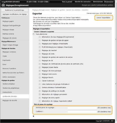 Le mot de passe dans [Mot de passe de cryptage] sera demandé lors de l'importation des données de réglage exportées. Utilisez des caractères alphanumériques.
