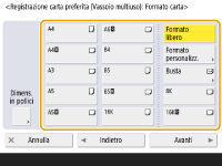 Se <Specificare sempre> in <Impostazioni predefinite vassoio multiuso> viene impostato su <Carta preferita>, viene visualizzata una schermata che consente di selezionare la propria "Carta preferita" quando si carica la carta nel vassoio multiuso. <Impostazioni predefinite vassoio multiuso> |
