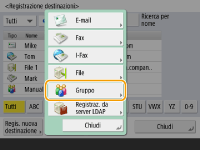 ![]() | È possibile combinare in un gruppo più destinazioni registrate nella Rubrica (Registrazione delle destinazioni nella Rubrica). È possibile utilizzare questa funzione per inviare i documenti e i dati di backup nello stesso momento poiché è possibile registrare diversi tipi di destinazioni nello stesso gruppo. Ad esempio, è possibile registrare insieme gli indirizzi e-mail e gli indirizzi IP del file server in un unico gruppo. |
