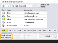 ![]() | È possibile registrare il numero di fax di un destinatario o un indirizzo e-mail da utilizzare quando si inviano i documenti digitalizzati nella Rubrica. Inoltre, è possibile registrare una destinazione I-fax, la posizione di una cartella file server (indirizzo IP e percorso) e l'archivio (Area di condivisione) di una stampante multifunzione Canon nella Rubrica come destinazione. |