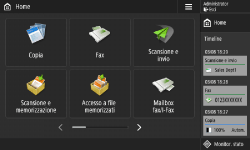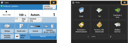 Nella schermata <Home>, premere i pulsanti funzione per visualizzare la schermata Funzioni di base, che consente di accedere alle funzioni base quali copia, fax e scansione. Sebbene le voci di visualizzazione e impostazione nella schermata Funzioni di base siano diverse in base alle funzioni, è possibile modificare le impostazioni in base alle proprie esigenze.