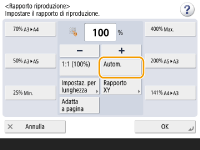 ![]() | È possibile ingrandire o ridurre specificando il rapporto di riproduzione (%). È possibile specificare o rapporti verticali e orizzontali singolarmente. Ingrandimento o riduzione delle copie specificando il rapporto di riproduzione | |