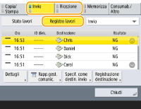 Premendo <Dettagli> <Ritrasmissione> è possibile reinviare i documenti non inviati correttamente. Per specificare un'altra destinazione, premere <Variazione destinazione>. Per i documenti con più destinazioni specificate usando lo stesso metodo di invio, premere <Elenco trasmis. seq.>, selezionare una destinazione, quindi premere <Ritrasmissione> o <Variazione destinazione>.È possibile reinviare i documenti quando <Eliminazione lavori TX non riusciti> è impostato su <Off> (<Eliminazione lavori TX non riusciti>). Non dimenticare che non è possibile reinviare i documenti inviati con invio diretto/invio manuale/PC fax. È possibile cambiare le destinazioni dei documenti impostati per l'invio ad una determinata ora, nonché dei documenti che non sono stati inviati correttamente. Non dimenticare che non è possibile cambiare le destinazioni per i documenti con più destinazioni specificate in fase di invio oppure quando l'inserimento di una nuova destinazione è limitato (Limitazione delle destinazioni disponibili). È possibile modificare la destinazione per un lavoro annullato a causa di errori di trasmissione, oppure per un lavoro in attesa di invio nella modalità di invio ritardato. Non è possibile selezionare più destinazioni insieme. Inoltre, non è possibile modificare le destinazioni in un gruppo contemporaneamente. |