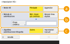 2 | Configurare le impostazioni necessarie. ![]() <Modo IKE>Selezionare la modalità operativa per il protocollo di scambio codice. La sicurezza aumenta se si seleziona <Principale> poiché la stessa sessione IKE è crittografata, ma la velocità della sessione è più lenta rispetto a quando si seleziona <Aggressive>, che non esegue la crittografia dell'intera sessione. <Metodo di autenticazione>Selezionare uno dei metodi di autenticazione descritti di seguito.