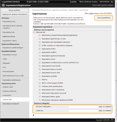 Viene richiesta la password in [Password crittografia] ogni volta che vengono importati i dati di impostazione esportati. Utilizzare caratteri alfanumerici.