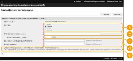 Controllo del registro di comunicazione per la sincronizzazioneÈ possibile controllare il registro di comunicazione dalla schermata per la sincronizzazione delle impostazioni personalizzate. È anche possibile scaricare il registro come file. Quando la macchina server non è in grado di comunicare temporaneamente, "Avviso" viene registrato come livello. "Errore" viene registrato come livello quando la quantità massima di dati che è possibile registrare è stata superata o in caso di errore nell'autenticazione con la macchina server. Impostazioni di sincronizzazione sempliciPer le stampanti multifunzione Canon nello stesso router, è possibile avviare la sincronizzazione delle impostazioni personalizzate dal pannello comandi. Per una macchina client: Premere <Impostazioni gestione> <Gestione periferiche> impostare <Sincronizzazione impostazioni personalizzate (Client)> su <Abilita>.Come metodo di autenticazione deve essere abilitata l'opzione Autenticazione utente. Nota sull'annullamento della sincronizzazioneQuando in una macchina client si annulla la sincronizzazione delle impostazioni personalizzate, tale macchina non sarà più in grado di recuperare le impostazioni di ciascun utente registrato nella macchina server. Pertanto, si tenga presente che i dati personalizzati di una macchina utilizzata come macchina client potrebbero non essere aggiornati dopo l'annullamento della sincronizzazione delle impostazioni personalizzate. |