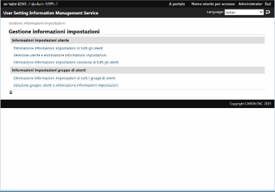 Fare clic su [User Setting Information Management Service] nella pagina del portale. Schermata IU remota