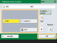 È possibile utilizzare <Regis. nuova destinazione>, <Dettagli/Modifica> e <Elimina> in <Registra/Modifica> nella schermata <Rubrica (Locale)> per registrare nuove destinazioni, verificarne i dettagli e modificare/eliminare le destinazioni. Registrazione delle destinazioni Per utilizzare la rubrica remota, è necessario configurare le impostazioni della macchina server. Impostare l'apertura della rubrica remota esternamente sulla macchina server. |
