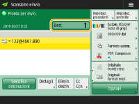 Per verificare il numero totale di destinazioni specificateIl numero totale di destinazioni specificate viene visualizzato in alto a destra della schermata. Ciò consente di verificare che il numero di destinazioni sia corretto prima dell'invio. ![]() Per annullare immediatamente un lavoro in corso di invioSe si preme sul pannello di controllo durante l'invio di un lavoro, viene visualizzato il messaggio <Si vuole annullare il seguente lavoro di invio?>. Premere <Sì> per annullare l'invio.È possibile selezionare <Ultimo lavoro ricevuto> o <Lavoro in corso di invio> per scegliere il lavoro da annullare. <Lavoro da annullare alla pressione di Stop> Premere in presenza di più lavori di invio per visualizzare la schermata di selezione del lavoro di invio da annullare. Se il lavoro di invio da annullare non è visualizzato, premere <Controllo altri lavori> per visualizzare <Lavori invio>. Selezionare il lavoro da annullare e premere <Annulla>.Per controllare gli stati dei documenti inviati e salvatiNella schermata <Monitor. stato>, è possibile verificare gli stati dei documenti inviati/salvati. Questa schermata consente di inviare/salvare nuovamente i documenti oppure di annullare l'invio/salvataggio dopo la verifica degli stati. Controllo di stato e registro per i documenti acquisiti Se <Visualizzazione notifica ad accettazione lavoro> è impostato su <On>, la schermata <Monitor. stato> potrebbe essere visualizzata dalla seguente schermata, visualizzata dopo la ricezione di un lavoro inviato. <Visualizzazione notifica ad accettazione lavoro> ![]() Per stampare il rapporto dei risultati di invio/salvataggioNella schermata delle funzioni di base per la scansione, se si preme <Opzioni> <Rapporto risultato TX> è possibile impostare la stampa automatica del rapporto che elenca i risultati dell'invio/salvataggio.Per impostare per ogni lavoro da <Opzioni>, è necessario selezionare <Solo se errore> o <Off> in <Rapporto risultato TX>, quindi impostare <Consentire stampa da Opzioni> su <On>. Nome fileQuando si invia/salva un file, il nome file viene automaticamente impostato in base al seguente formato. È possibile cambiare l'impostazione in modo da poter assegnare un altro nome. Impostazione di un nome di file Quando si invia per e-mail il formato "Numeri lavoro (quattro cifre)_numeri pagina (tre cifre).nome estensione file", ad esempio "1042_001.jpg" Quando si salva in un file server il formato "Anno, mese, giorno, ora, minuti e secondi di salvataggio del file (14 cifre).nome estensione file", ad esempio "20151030133541.jpg" Oggetto e-mailL'oggetto inserito in <Oggetto predefinito> viene impostato automaticamente (<Oggetto predefinito>). Se si specifica un oggetto diverso, modificare le impostazioni oppure specificare l'opzione ogni volta che si spedisce un'e-mail (Specifica delle impostazioni e-mail). |
