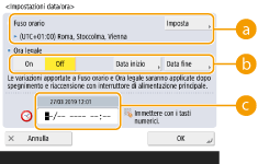 <Ora legale>Per impostare l'ora legale, premere <On> e impostare la data e l'ora per <Data inizio> e <Data fine>. Per impostare la data, specificare il giorno della settimana e la settimana del mese.