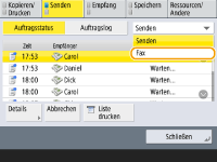 Um einen Auftrag, der gerade gesendet wird, sofort abzubrechen, gehen Sie wie folgt vor.Wenn Sie auf dem Bedienfeld drücken, um einen Faxauftrag während des Sendevorgangs abzubrechen, erscheint die Meldung <Soll der folgende Sendeauftrag abgebrochen werden?>. Drücken Sie <Ja>, um den Versand des Faxes abzubrechen.Sie können <Zuletzt empfangener Auftrag> oder <Gesendeter Auftrag> wählen, um den Auftrag zu bestimmen, der abgebrochen werden soll. <Abzubrechender Auftrag bei Betätigen von Stopp> Drücken Sie bei mehreren Sendeaufträgen auf , um die Anzeige zur Auswahl des abzubrechenden Sendeauftrags aufzurufen. Wenn der Sendeauftrag, den Sie abbrechen möchten, nicht angezeigt wird, drücken Sie <Andere Aufträge prüf.>, um <Sendeaufträge> einzublenden. Wählen Sie den Auftrag, den Sie abbrechen möchten, und drücken Sie <Abbrechen>. |