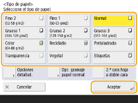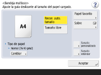 <Aceptar>. Registrar el tamaño y el tipo de papel de uso frecuente para la bandeja multiuso