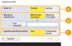 Seleccione el modo de funcionamiento para el protocolo de intercambio de claves. La seguridad mejora si selecciona <Principal> porque la propia sesión IKE está cifrada, pero la velocidad de la sesión en más lenta que con <Agresivo>, que no cifra toda la sesión.