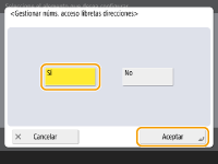 <Establecer destino>  <Gestionar núms. acceso libretas direcciones>  <Sí>  <Aceptar>