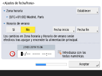 Especifique la fecha y hora del equipo. ![]() ![]() Introduzca la fecha y la hora, y pulse <Aceptar>. Configure <Zona horaria> y <Horario de verano> según proceda. Para obtener más información, consulte Configurar la fecha/hora. | |