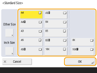 1 | Press <Custom Size>. ![]() You can specify the paper size as <Free Size>, which eliminates the need to enter the paper size setting. Specify <Free Size> when you load paper of unknown size to use for copying or when the paper size is already registered in the printer driver. |
