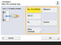 1 | Press <Envelope>. The envelope paper type cannot be selected from the details screen of <Paper Type>. To select the envelope paper type, register the paper type in <Register Favorite Paper (Multi-Purpose Tray)>, then press <Favorite Paper> in step 2 the button to which the envelope paper type has been registered <OK>. Registering Frequently Used Paper Size and Type for the Multi-purpose Tray |