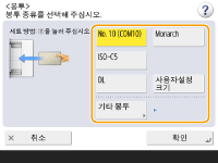 1 | <봉투>을 누릅니다. <용지 종류>의 세부 정보 화면에서 봉투 용지 종류를 선택할 수 없습니다. 봉투 용지 종류를 선택하려면 <자주 사용하는 용지 등록 (수동급지대)>에서 용지 종류를 등록한 다음 2단계의 <자주 사용 하는 용지> 봉투 용지 종류를 등록한 버튼 <확인>을 누릅니다. 수동 급지대에서 자주 사용하는 용지 크기 및 종류 등록 |