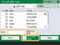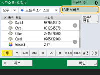 <주소록 (로컬)> 화면의 <등록/편집>에서 <신규수신인 등록>, <삭제/편집> 및 <삭제>를 사용하여 새 수신인을 등록하고, 세부 정보를 확인하여, 수신인을 편집/삭제할 수 있습니다. 원격 주소록을 사용하려면 서버 기기 설정을 구성해야 합니다. 외부에서 서버 기기의 원격 주소록을 열도록 설정합니다. |