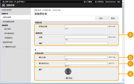 [顯示名稱:]輸入使用者的名稱。顯示名稱會顯示為強制保留列印的使用者名稱,並作為傳送電子郵件時的傳送者名稱。