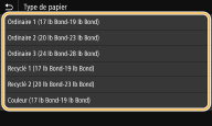 Une fois les paramètres papier par défaut enregistrés, l'écran de définition du papier ne s'affiche plus lorsque vous insérez du papier, et les mêmes paramètres sont appliqués systématiquement. Si vous chargez un papier de format ou de type différents sans modifier les paramètres papier, l'appareil risque de ne pas imprimer correctement. Pour éviter ce problème, sélectionnez <Spécifier lors du chargement du papier> à l'étape 3, puis chargez le papier. |
