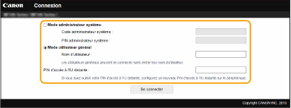 Sélectionnez [Mode administrateur système] ou [Mode utilisateur général], puis saisissez une valeur dans [PIN d'accès à l'IU distante].