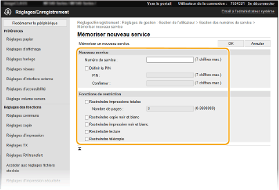 2 | Spécifiez les paramètres obligatoires. [Numéro de service] Saisissez l'ID de service à enregistrer. [Définir le PIN] Pour définir un code PIN, cocher la case et saisissez le même nombre dans les zones de texte [PIN] et [Confirmer]. [Fonctions de restriction] Vous pouvez limiter le nombre de pages à imprimer et les fonctions accessibles aux services. Pour limiter le nombre de pages à imprimer, cochez la case associée au type souhaité et saisissez le nombre de pages approprié dans [Nombre de pages]. Cochez les cases des fonctions dont vous souhaitez restreindre l'accès. Si la case [Restreindre lecture] est cochée, les fonctions Enregistrer sur périphérique mémoire USB, Envoyer un e-mail et Envoyer dans un dossier partagé ou un serveur FTP sont toutes restreintes. Vous pouvez également restreindre d'autres méthodes qui numérisent des documents en les important sur un ordinateur, mais, dans ce cas, vous ne pouvez pas bloquer l'accès pour chaque ID de service ( Blocage de tâches en cas de numéro de service inconnu). |