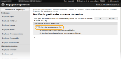 Si la case est cochée, vous pouvez sélectionner <Ordinateur> ou <Scanner distant> sur l'écran principal et numériser des documents depuis un ordinateur à tout moment. Si la case n'est pas cochée, vous ne pouvez pas numériser des documents depuis un ordinateur si la fonction d'ID de service est activée. Il est impossible de restreindre la numérisation de documents depuis un ordinateur pour des ID de service particuliers.