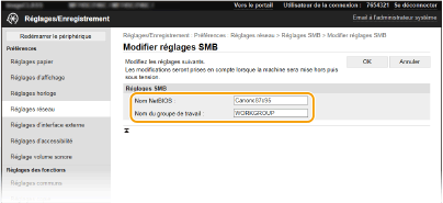 | | Le protocole SMB (Server Message Block) est un protocole permettant de partager des ressources comme des fichiers et des imprimantes entre plusieurs périphériques d'un réseau. L'appareil utilise le protocole SMB pour enregistrer les documents numérisés dans un dossier partagé. En fonction de votre réseau, vous devrez peut-être définir le nom NetBIOS et le nom du groupe de travail. |